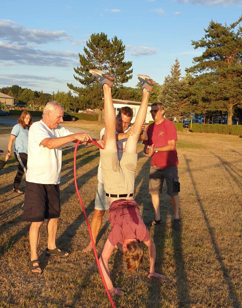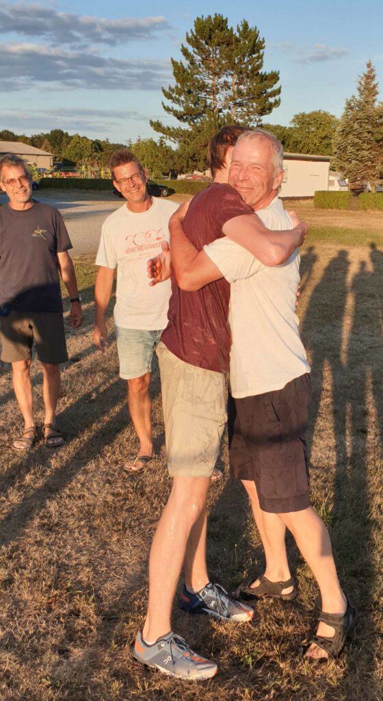 In der Flugausbildung schloss am Sonntag Jonathan den nächsten Ausbildungsabschnitt ab. Nach dem erfolgreichen „B“-Flug gab es am Abend die traditionelle „Gratulation“ mit dem Wasserschlauch. Nass wie er war ließ er es sich nicht nehmen, seinen Fluglehrer Hubertus zu „herzen“.