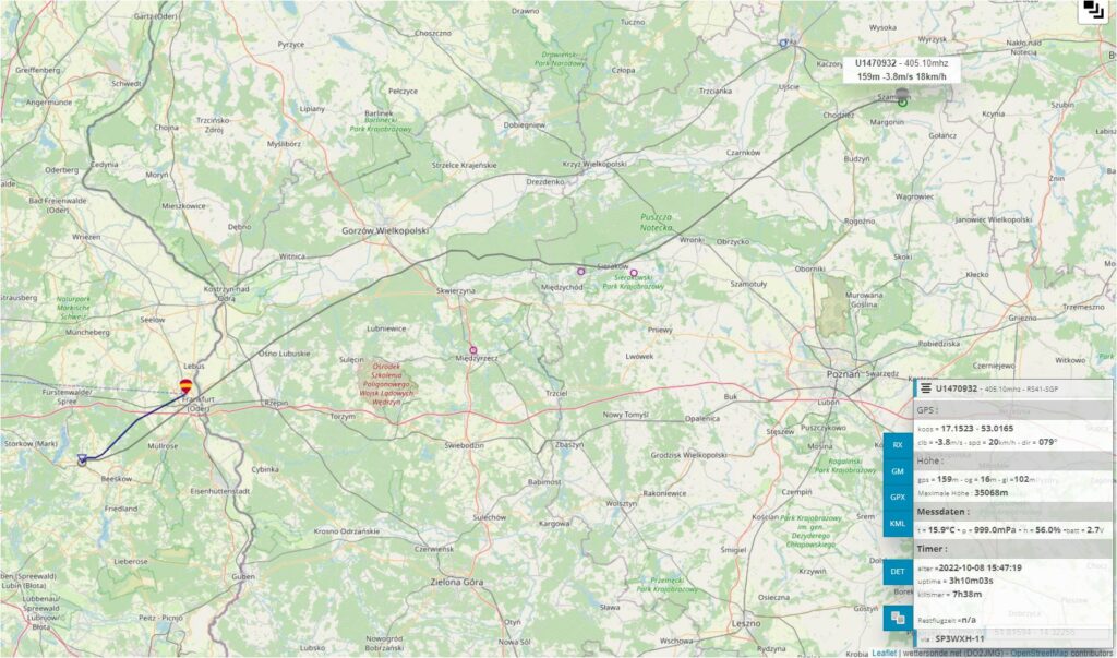 Weitere Daten und der Flugweg der Sonde – siehe Screenshots (Quelle: www.wettersonde.net)