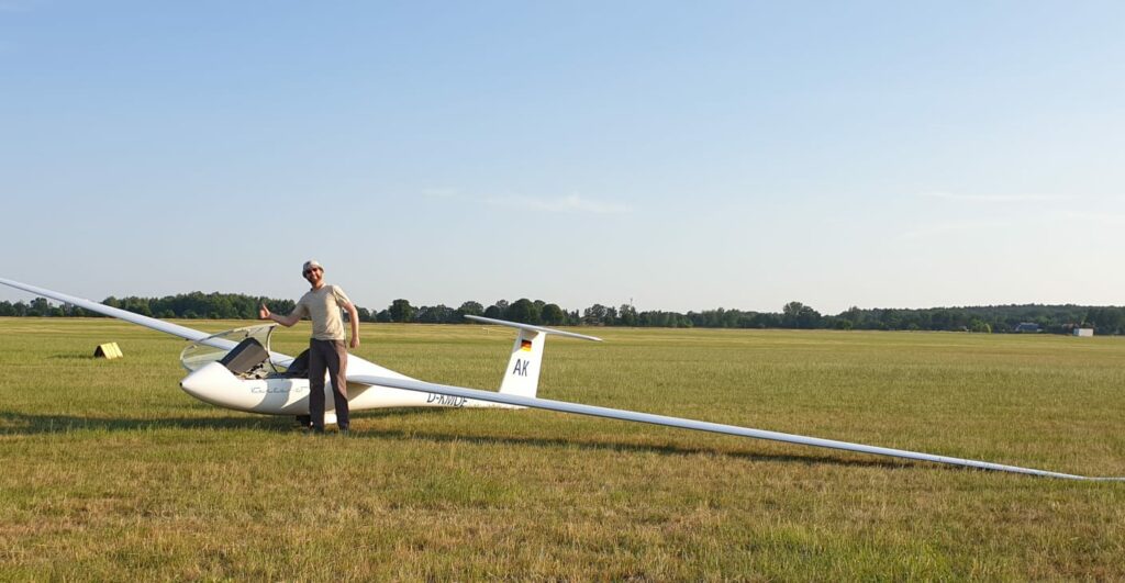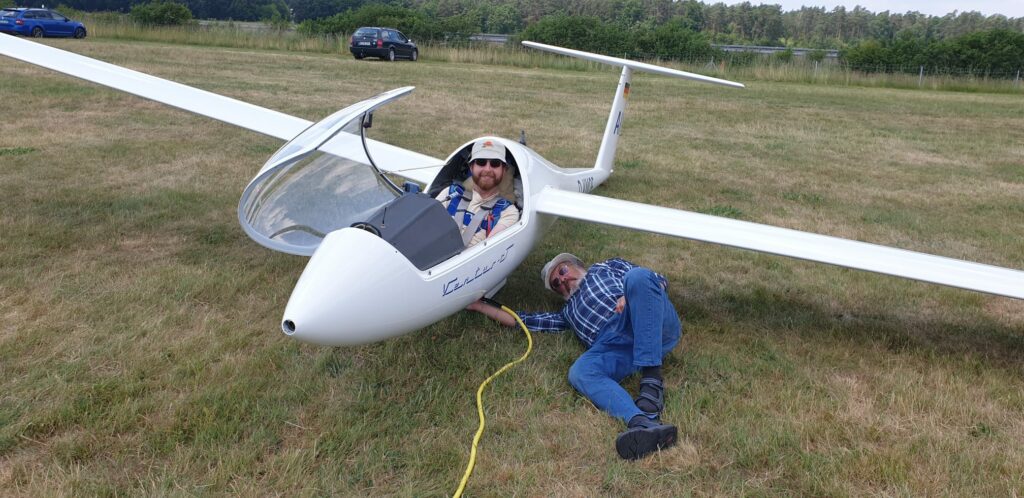 Am Samstag waren Dennis, Alex, Simone und Thomas unterwegs, sowie Jonathan und Hubertus in der DG-1000 für eine Streckenflugeinweisung – einer der letzten Abschnitte in Jonathans Ausbildung zum Lizenzpiloten. Thomas schaffte seine „Silber-C“, eine 50km Ziel-Rückstrecke nach Bronkow. Das ist eine tolle Leistung und ein erster wichtiger Schritt in Richtung größerer Streckenflüge.