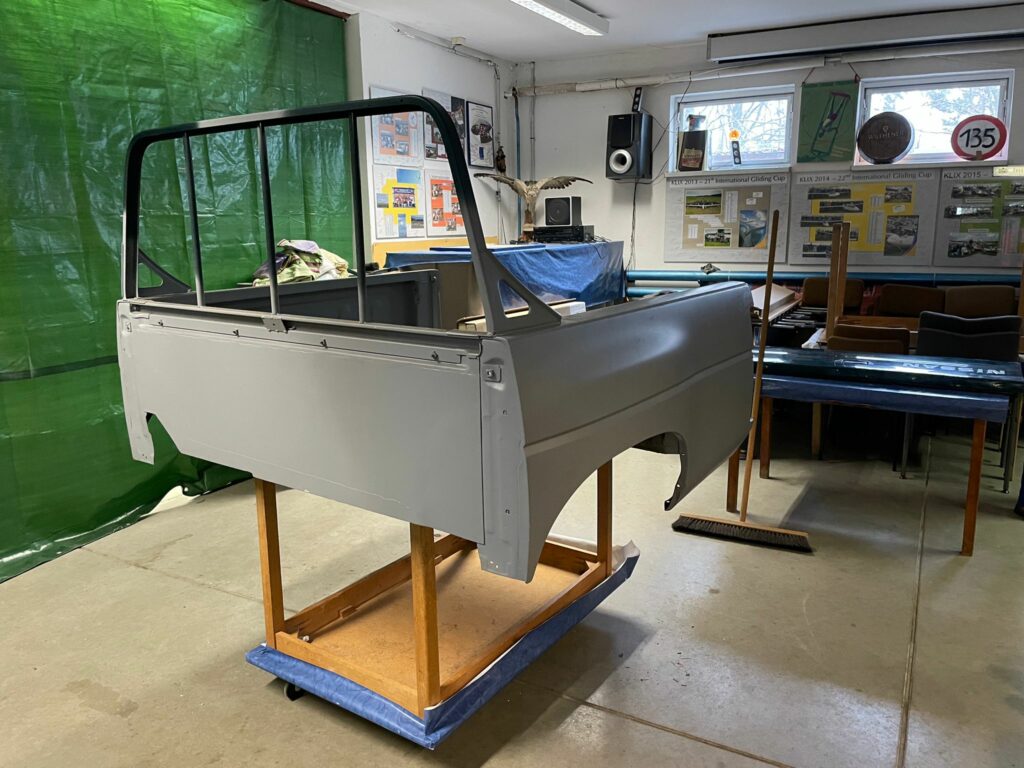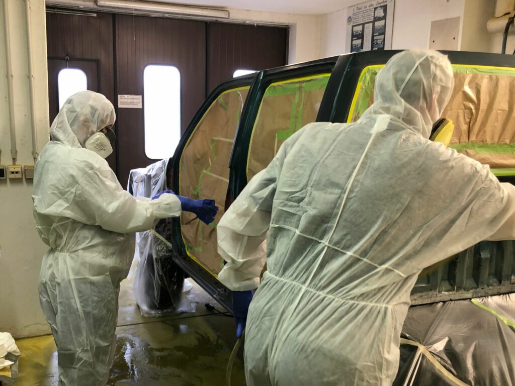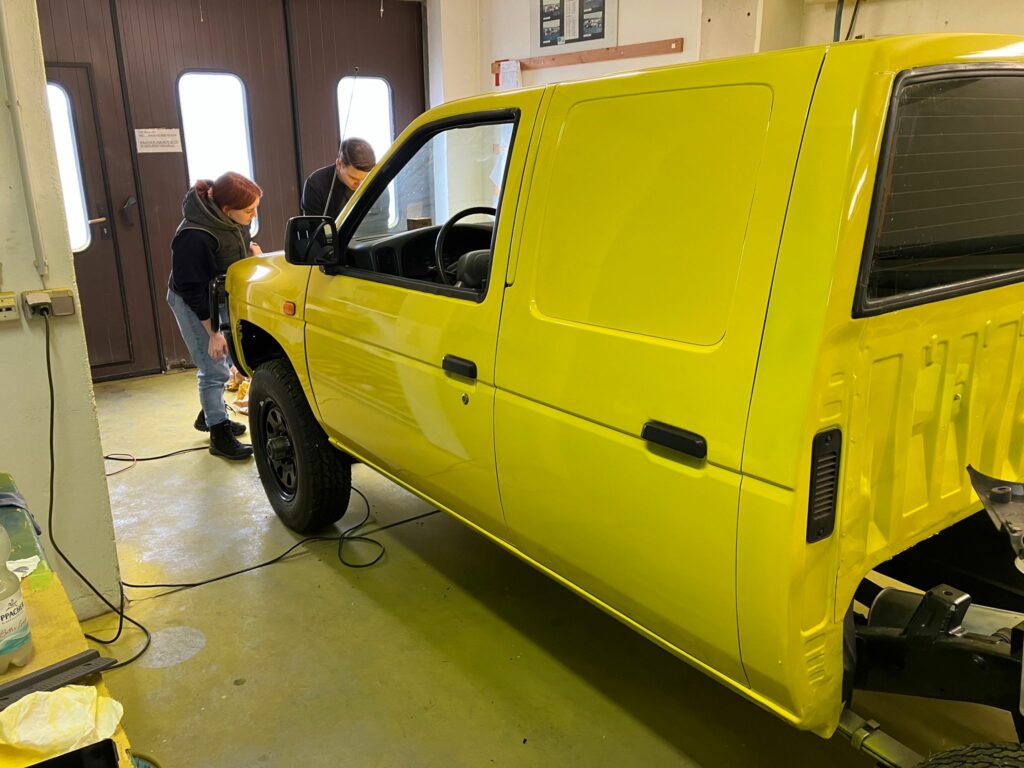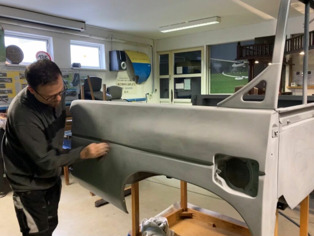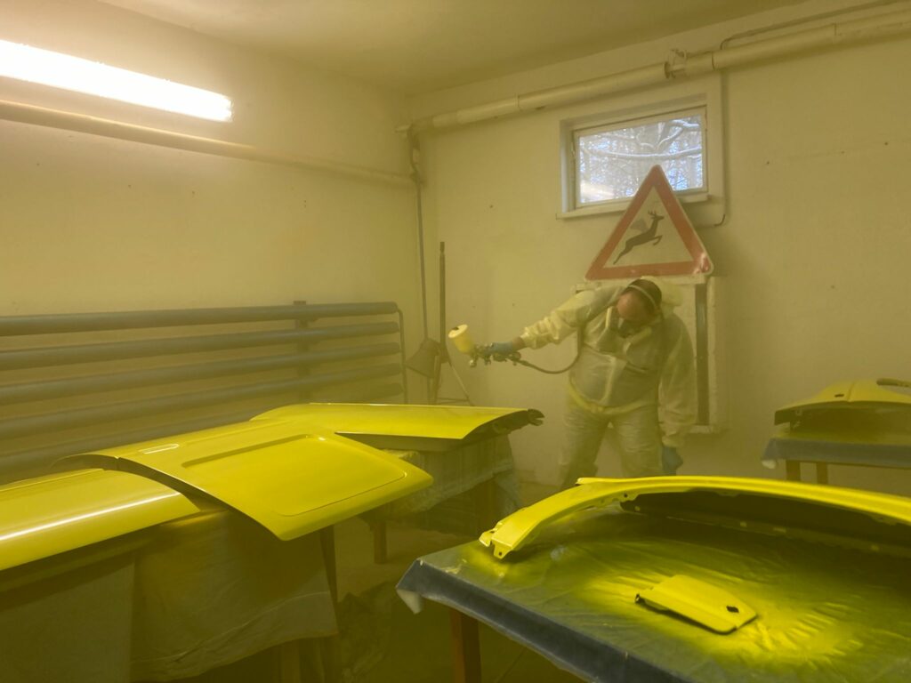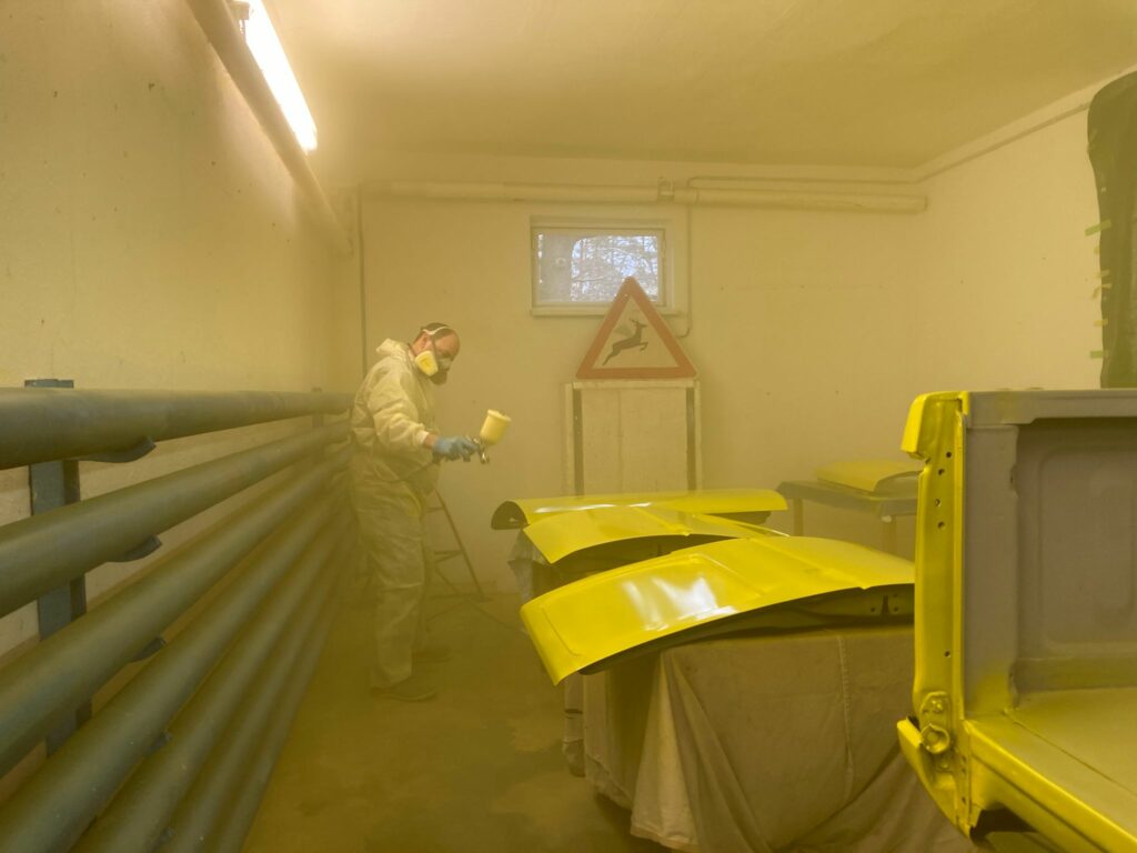 Gleichzeitig wurden auch die Karosserieteile zur Lackierung vorbereitet. Denn auch auf die Neulackierung in das typische „warngelb“, in welches fast alle unsere Flugplatzfahrzeuge eingefärbt sind, wurde nicht verzichtet. Auf den folgenden Bildern bekommt man einen Einblick in die Lackierarbeiten von Markus und Antonia, die in unserer Werkstatt die neue Farbe auf die Bauteile aufbringen.