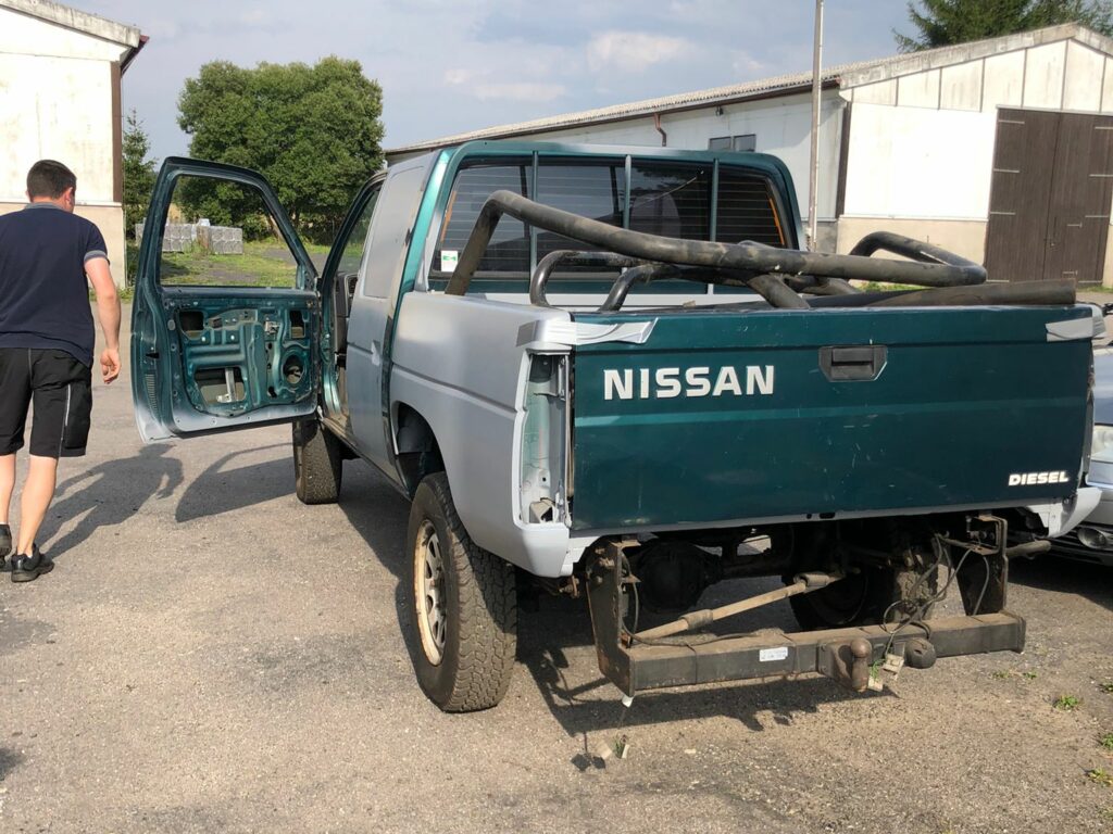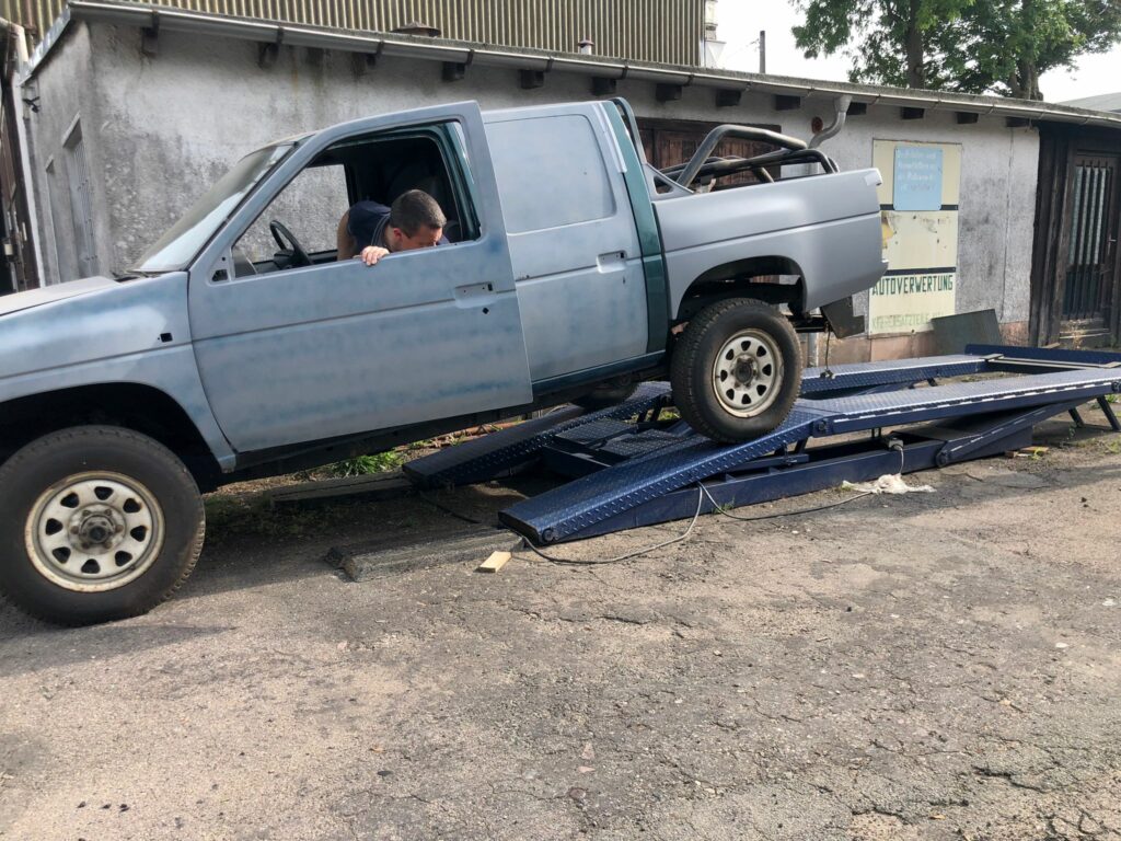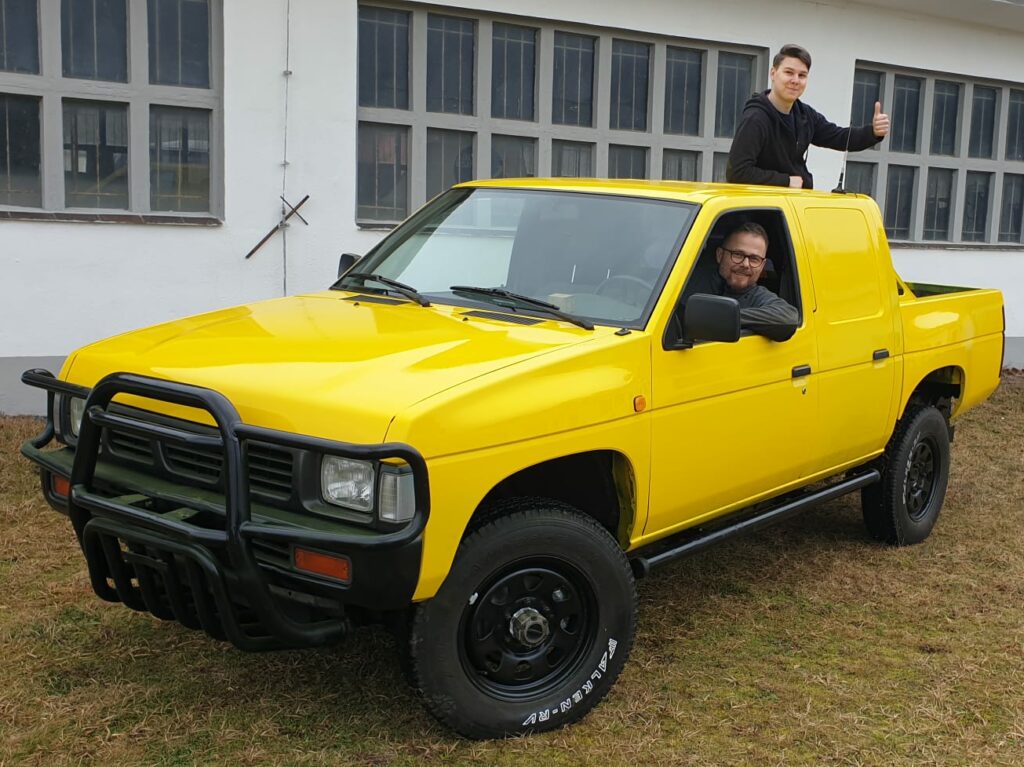 Paul und Thomas haben sich also im Herbst des letzten Jahres auf die Suche nach einem Nachfolger begeben. Und das mit Erfolg: Kurze Zeit später fuhren sie mit dem Neuzugang auf dem Anhänger auf dem Flugplatzhof vor. Im Schlepptau hatten sie einen Nissan MD21, Baujahr 1998 mit einem Saugdieselmotor mit ca. 2.5 Liter Hubraum und Allradantrieb. Eine gute Plattform also, die uns durch ihre Robustheit hoffentlich lange gute Dienste leisten wird.