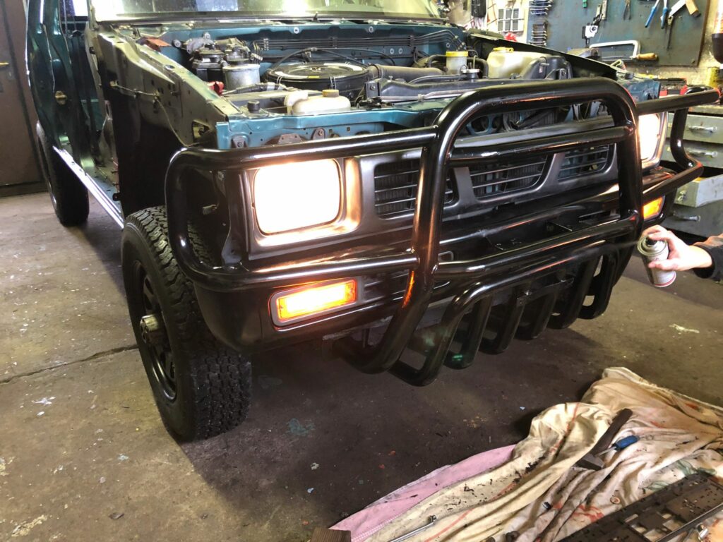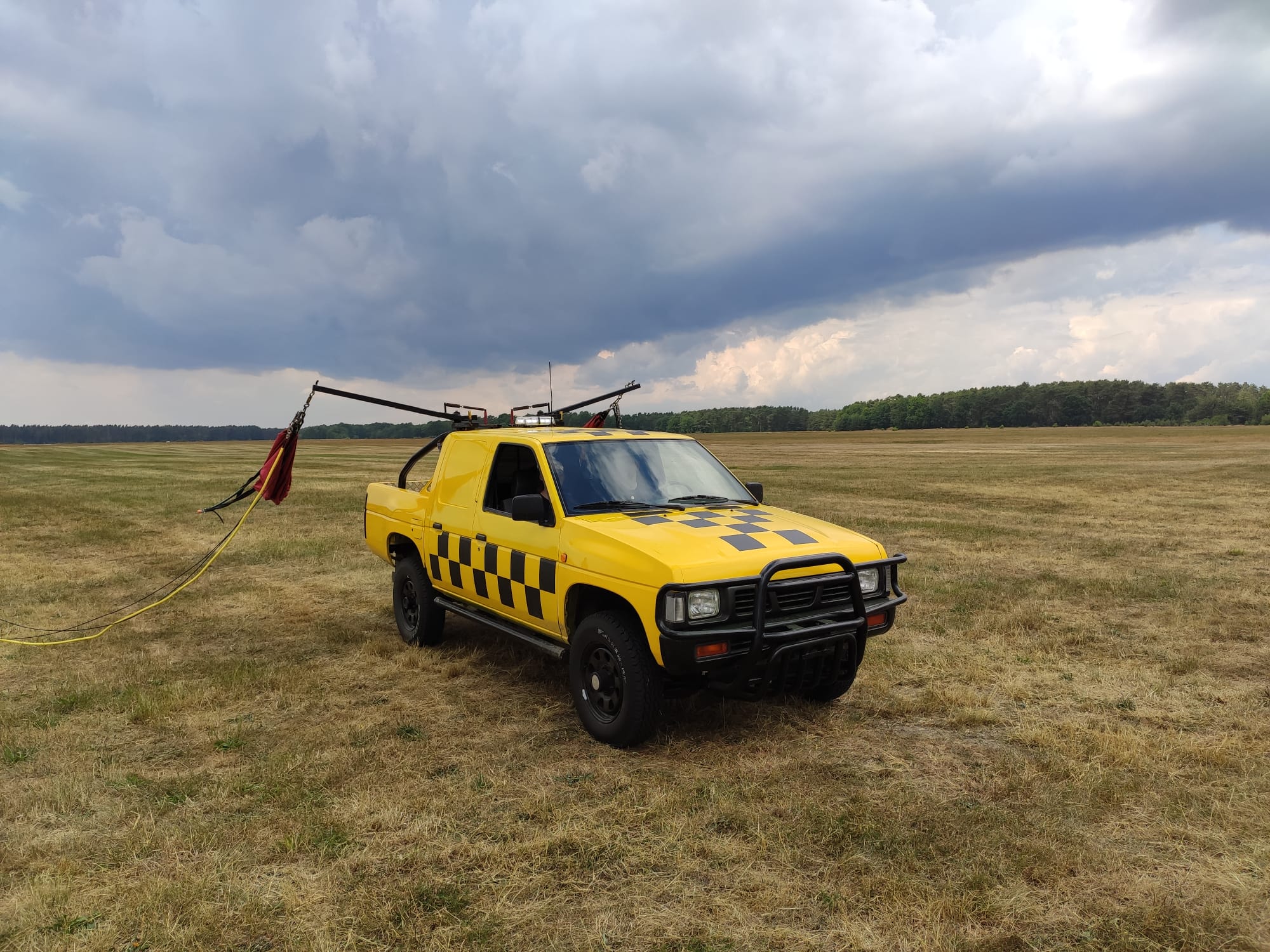 Für das gestalterische „Finish“ haben Peter und Ralf noch die schwarzen Vierecke angebracht. Jetzt steht der Nissan in korrekter Flugplatzoptik mit maximaler Sichtbarkeit da. Im letzten Schritt musste noch das Geweih am Fahrzeug angebracht werden. Nun ist der Pick-up aber für den Einsatz auf dem Flugfeld gerüstet und die Saison kann kommen!
