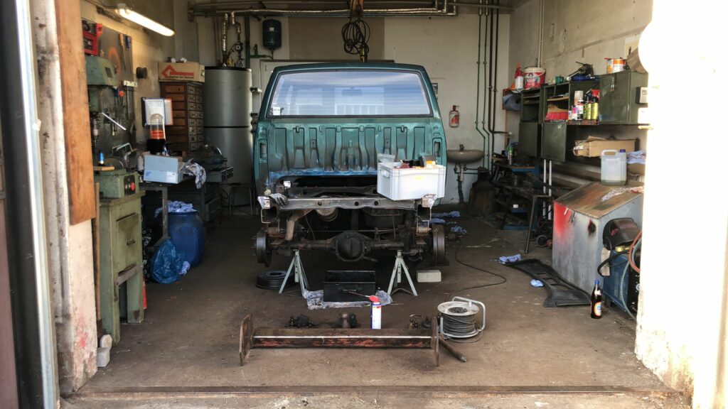 Nicht nur aufgrund des fortgeschrittenen Alters musste also noch hier und da ausgebessert werden. Wie gut, dass wir die dafür nötige Expertise in den Reihen unserer Mitglieder vorfinden. Der Hauptanteil der Schraubarbeit wurde von Paul und Thomas durchgeführt, während Ronny und Felix bei der Ersatzteilbeschaffung und Umkonstruktion des Geweihs fleißig waren (Geweih = Ausleger zum Einhaken der Windenseile am Fahrzeug, welche die Windenseile beim Zurückziehen auf Abstand zueinander halten). Das Fahrzeug musste zuerst einmal weiter demontiert werden, um am Leiterrahmen und Unterboden die Korrosion zu behandeln und den Rostschutz aufzubringen.