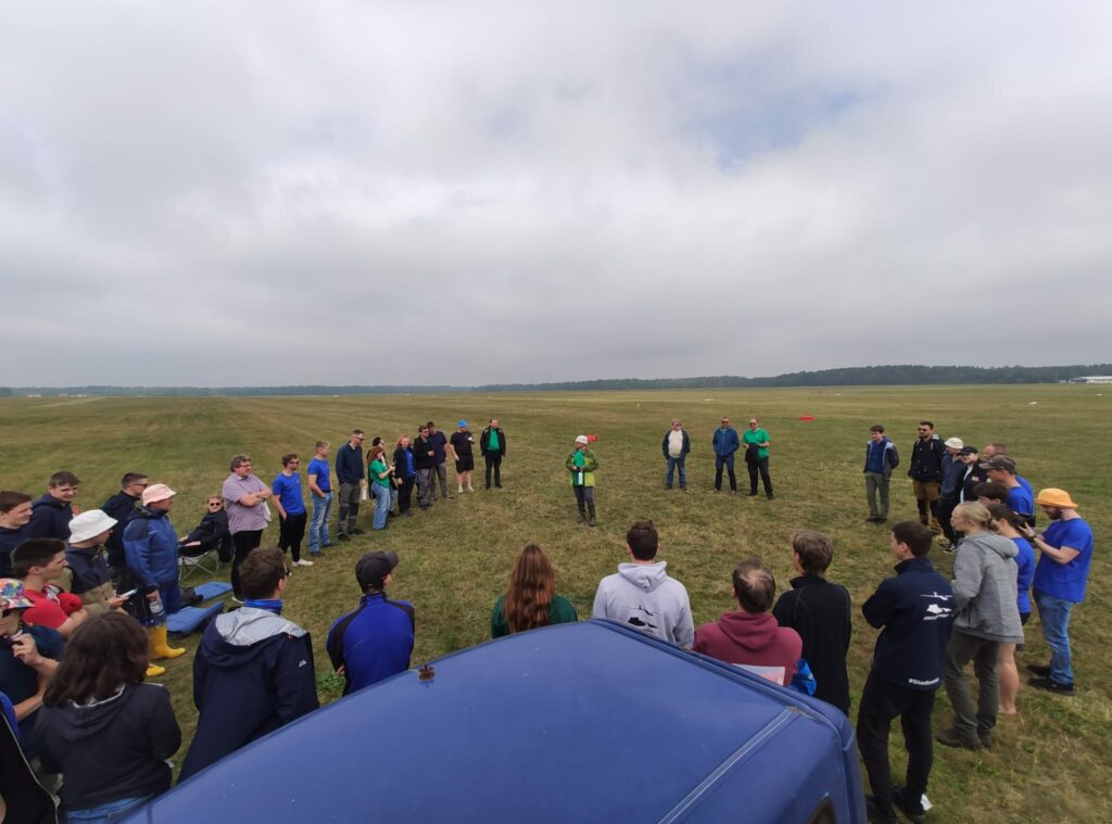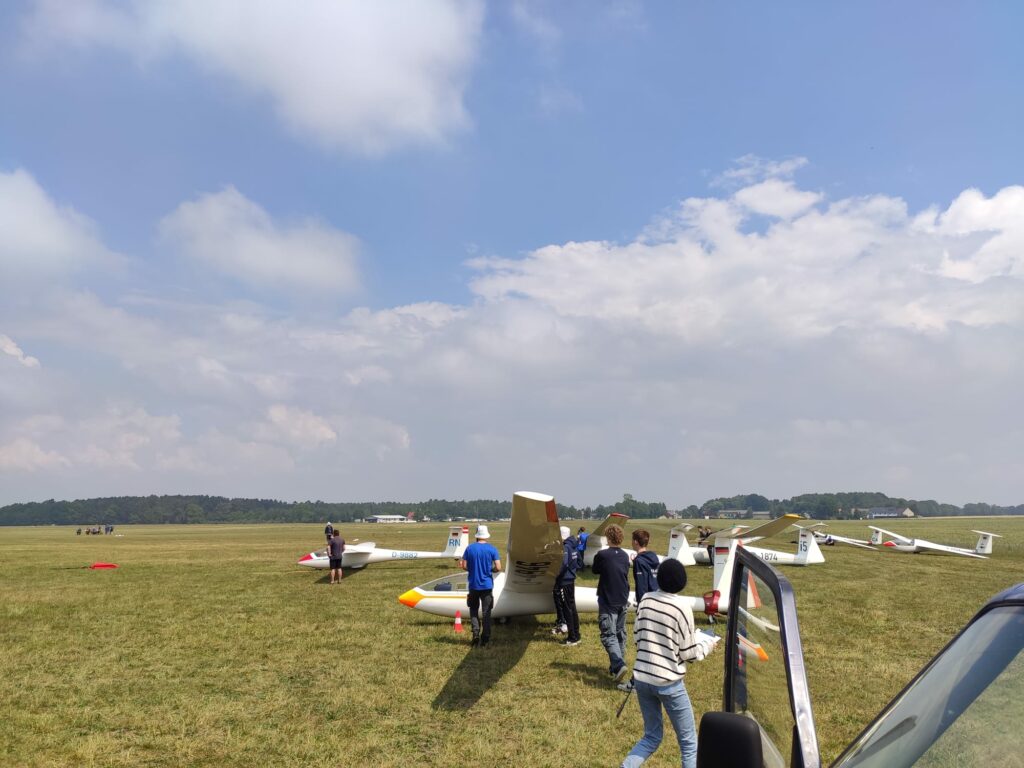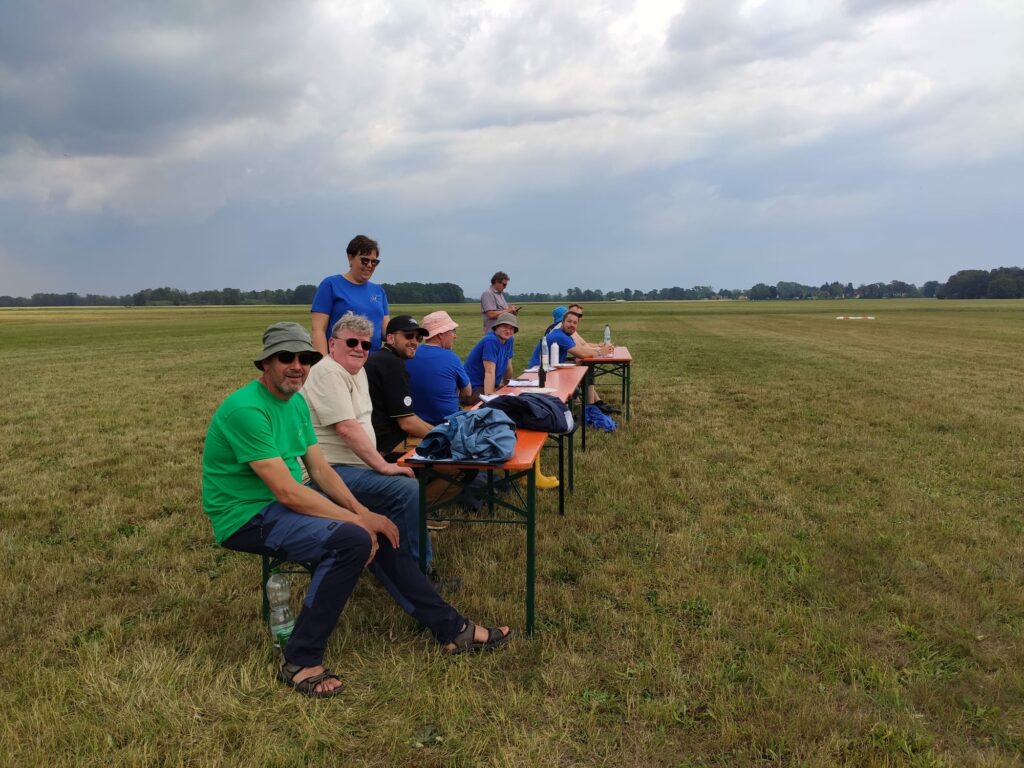 Der Samstag begann zeitig mit einem reichhaltigen Frühstück und dem Briefing. Direkt danach ging es schon auf das Feld hinaus. Der Wetterbericht hatte sich deutlich gebessert und bis zum zeitigen Nachmittag sollte es trocken bleiben. Damit hatten wir eine realistische Chance zumindest einen Teil der drei Wertungsdurchgänge zu absolvieren. Allerdings gab es noch ein Problem: Es hielt sich eine hartnäckige tiefe Wolkenschicht im Platzbereich, die den Start der Wertungsflüge unmöglich machte. In regelmäßigen Abständen wurden testweise Windenstarts durchgeführt, die aber immer mit dem Ergebnis endeten, dass die Wolkenbasis für den Wettbewerb noch nicht ausreichend hoch war. Also hieß es abwarten…