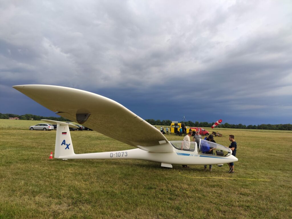 Nach ca. zwei Stunden war der erste Durchgang fast vollzogen, nur noch ein Flug fehlte. Doch ein ergiebiger Regenguss machte diesen unmöglich. Wir retteten alles was ging ins Trockene und dann hieß es abwarten. Nach einer Weile ließ der Regen nach und der letzte Start konnte doch noch durchgeführt werden. Die nun veränderten und anspruchsvollen Windverhältnisse meisterte die junge Pilotin vom Oschatzer Fliegerclub sehr gut.