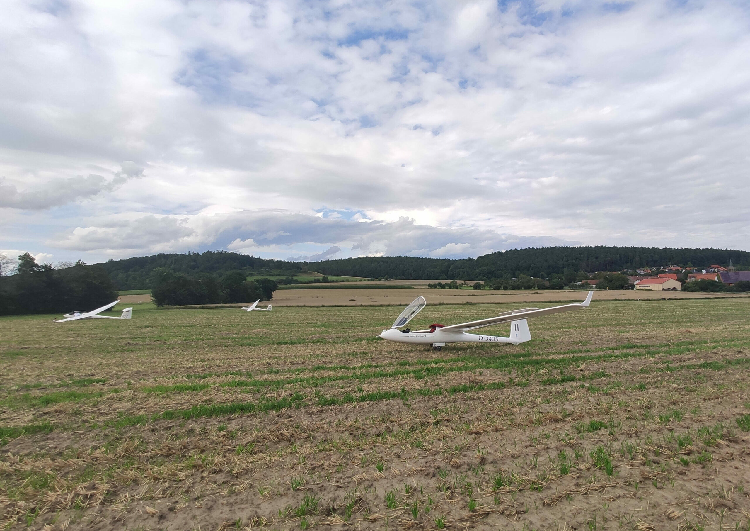 - Drei außengelandete Segelflugzeuge auf einem abgeernteten Feld