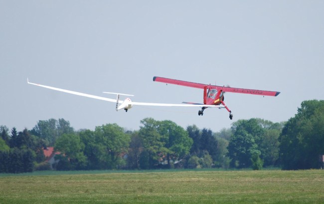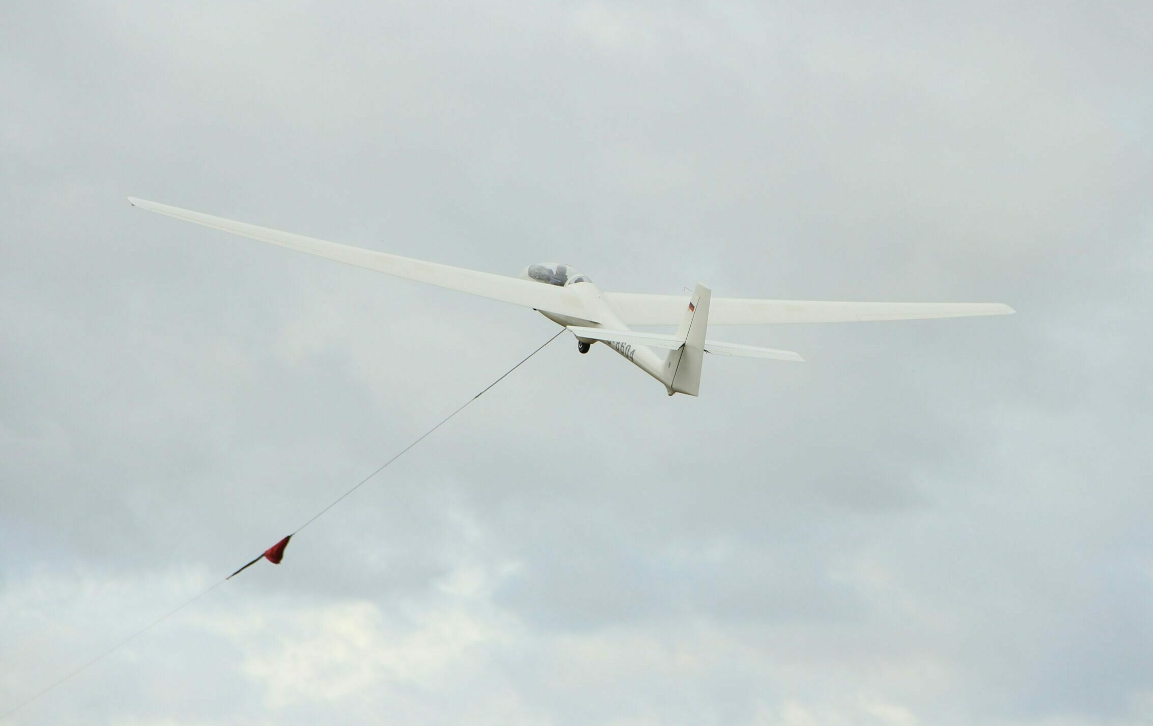 Für höhere Auskuppelhöhen werden Segelflugzeuge von Motorflugzeugen hochgeschleppt. Dieses Verfahren nennt man auch F-Schlepp und es funktioniert ähnlich wie das Abschleppen eines Autos. Die beiden Flugzeuge werden mit einem ca. 50 m langen Seil verbunden und steigen dann gemeinsam auf. Die Auskuppelhöhe kann dann frei gewählt werden. Die kurze Startphase ist übrigens der einzige Moment, bei dem der normale Segelflug mit der Emission von Treibhausgasen und lauteren Geräuschen verbunden ist. Den Rest des Fluges verbringen wir vollkommen „grün“ und nur begleitet vom Rauschen des Fahrtwindes.